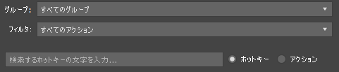 - アクションのリストをホットキーに基づいてフィルタします。表示するアクションを、すべてのアクション、既にホットキーが割り当てられているアクションのみ、カスタマイズされたホットキーを持つアクションのみ、または保存されていないホットキーを持つアクションのみの中から選択できます。