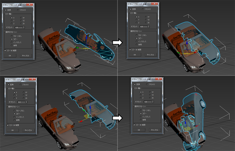 次の図では、[変換](Transform)オプション(左上)および[ジオメトリ](Geometry)オプション(右上)を使用して、最初に車がミラー化され、クローンが作成され、ワールド座標系でオフセットされます。図の下半分は、ローカル座標系を使用した同じプロセスを示しています。