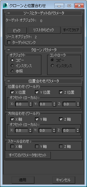 3ds Max によって[クローンと位置合わせ](Clone And Align)ダイアログ ボックスが開かれます。