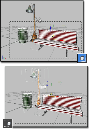 上: 領域内選択では、ごみ箱とベンチは選択されますが、街灯は選択されません。