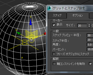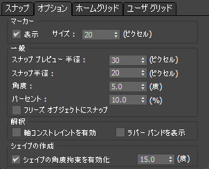 [グリッドとスナップ設定](Grid And Snap Settings)ダイアログ ボックスの[オプション](Options)パネルで、スナップに関するオプションを設定します。