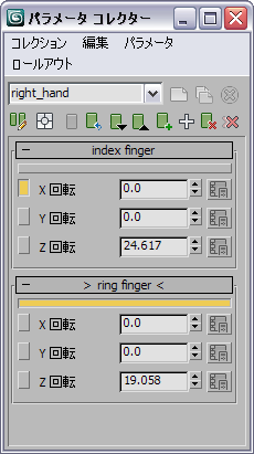 パラメータ コレクターの最も強力な機能の 1 つは、絶対モードまたは相対モードで、コレクション内のすべてのパラメータを同時に変更できることです。たとえば、キャラクタの手をアニメートしている場合、パラメータ コレクターを使用してすべての指を曲げ、拳を形成することができます。