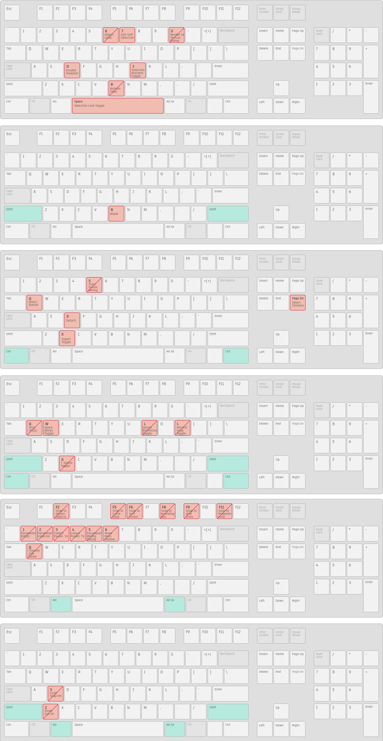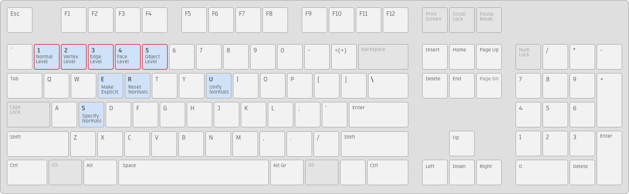*廃止されたホットキーは、内部を通る対角線付きで表示されます。