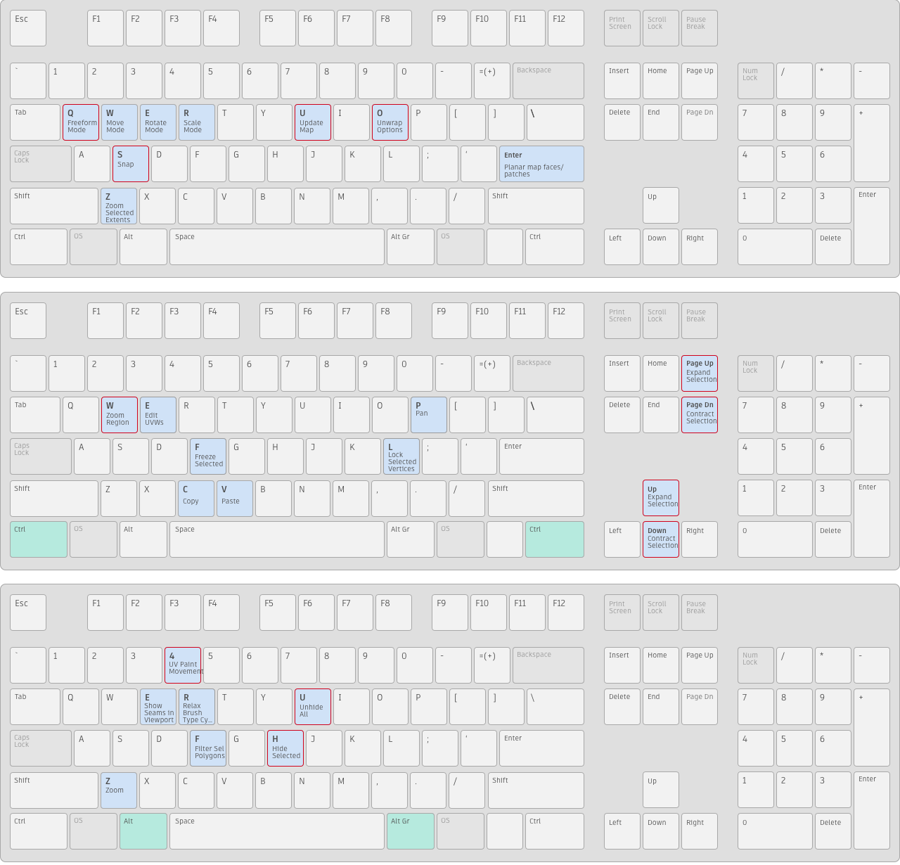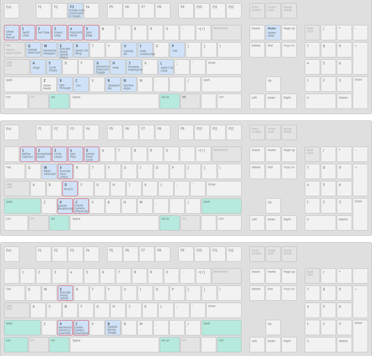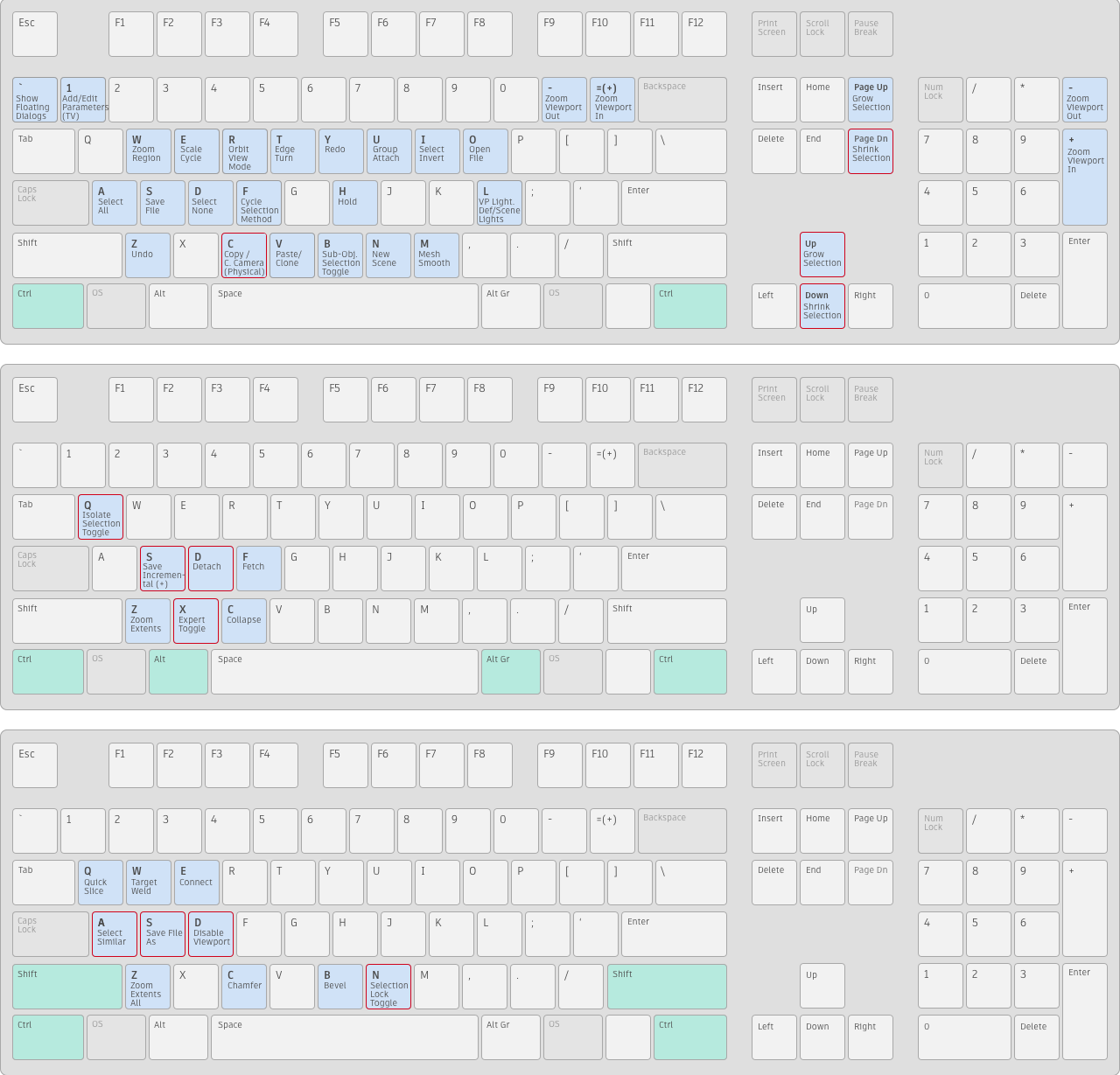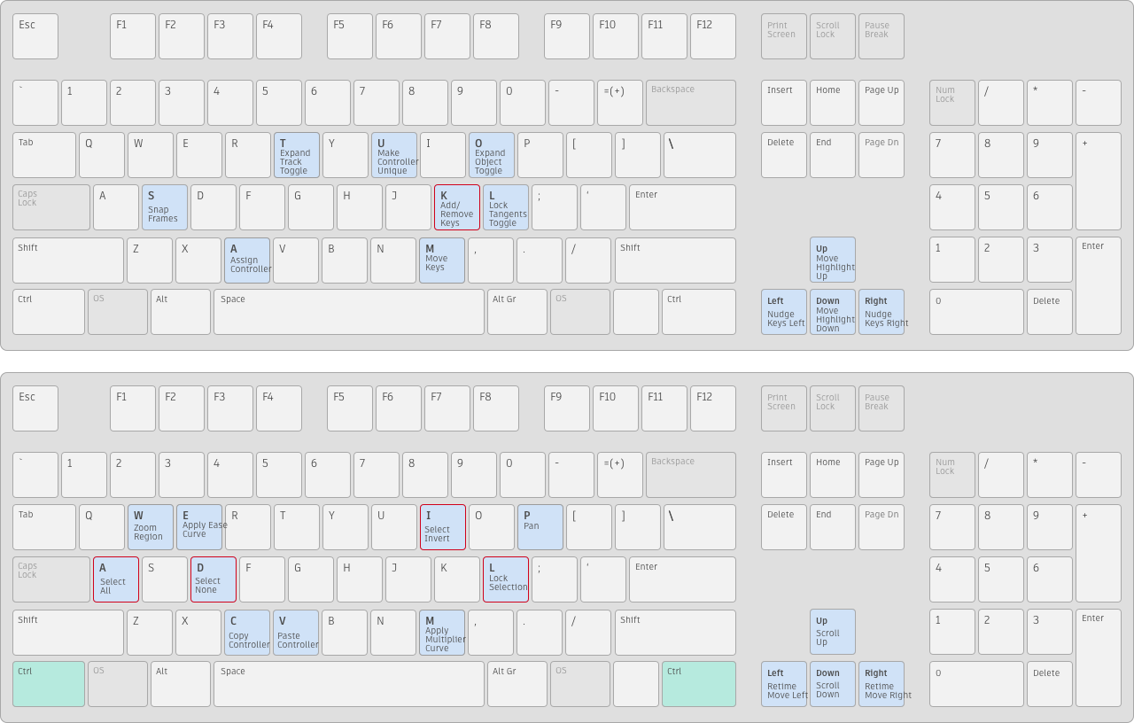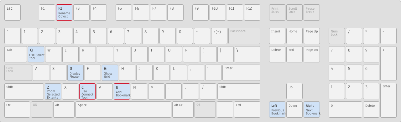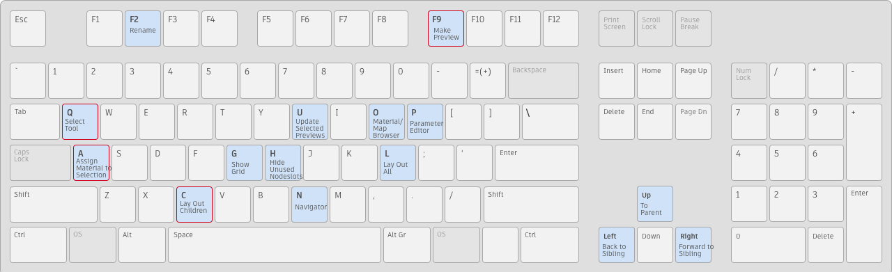 [Shift]+[A]などのホットキーで、組み合わせて押す必要のあるキーは緑で示しています。ホットキー エディタを使用すると、これらのキーをすべてカスタマイズできます。