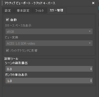 - シーンのカラー管理の基本設定に保存された設定を使用します。特定のビューポートのオプションを変更する場合は、このオプションを無効にします。