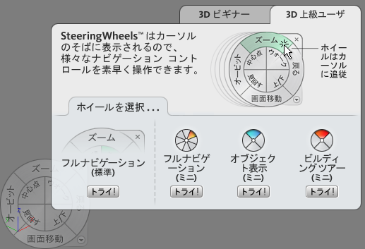 SteeringWheels(またはホイール)は、一般的なナビゲーション ツールの多くが組み合わさって 1 つのインタフェースになっているで、時間の節約になります。ホイールは、現在表示されているシーンの状態に応じて変化します。