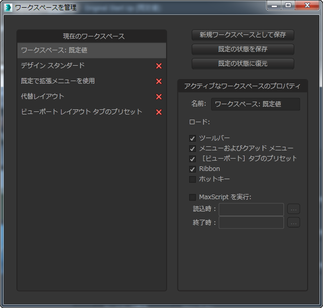 現在のセッションのワークスペースはすべて、次のセッションに引き継がれます。また、3ds Max では、前回のセッションの終了時にアクティブだったワークスペースが記憶されており、そのワークスペースがアクティブ状態に復元されます。