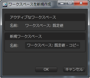 読み込み専用の[アクティブなワークスペース](Active Workspace)パラメータには、アクティブ ワークスペース(コピーされるワークスペース)の名前が表示されます。[新規ワークスペース](New Workspace)パラメータには、新規ワークスペースの名前が表示されます。既定ではこれは、アクティブ ワークスペース名に「 - コピー」( - Copy)が付加された名前です。名前を変更するには、[名前](Name)フィールドをクリックし、新しい名前を入力します。新規ワークスペースを作成し、その名前をドロップダウン リストに追加するには、[OK]をクリックします。また、作成しない場合は[キャンセル](Cancel)をクリックします。