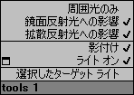 単一のライト オブジェクトがシーン内で選択されている場合、ビューポートのライト用のクアッド メニューの[ツール 1](Tool 1)(左上)が表示されます。