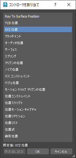 - 使用可能なコントローラの一覧から選択します。[コントローラを割り当て](Assign Controller)ダイアログ ボックスには、さまざまな種類のコントローラのサブセットのリストが表示されます。それらのメンバーは、ハイライト表示したトラックのタイプによって異なります。たとえば、回転トラックでは[回転](Rotation)コントローラのみ使用可能です。