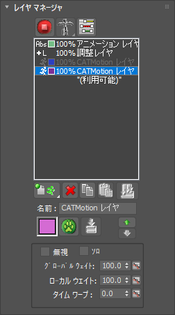 レイヤ マネージャは、CAT レイヤ システムのインタフェースです。このロールアウトは、CAT を使用してアニメートするときにレイヤ ワークフローの中心的な役割を果たします。レイヤの追加、削除、上下への移動、グローバルまたはローカル レイヤの重みの調整およびアニメートなどを実行できます。