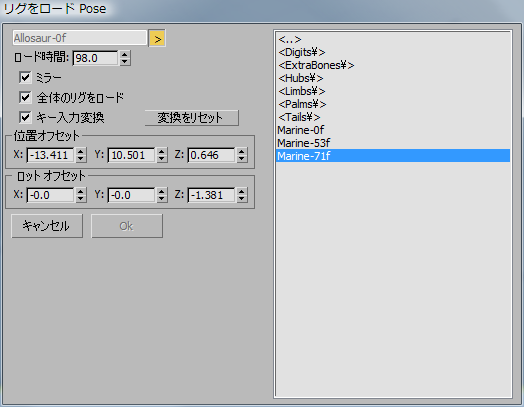 ロード時にポーズに変換を適用できます。[Pos Offset]フィールドと[Rot Offset]フィールドを使用して、保存されているポーズ データからの変換を値で指定します。たとえばポーズをオリジナルとまったく同じ位置にロードしてループ モーションを作成したり、移動と回転のオフセットを指定するといったことが可能です。