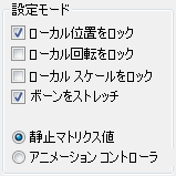 [設定モード](SetupMode)領域で[ローカル位置をロック](Lock Local Position)をオンにします。 この状態でボーンを移動しようとしても、位置がロックされているために何も起こりません。