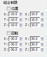 オンにすると、[X]/[Y]/[Z]設定を使用して、対応する軸にある選択されたボーンの位置オフセットの許容範囲を指定できます。ボーンにスーパーインポーズされたワイヤフレーム ボックスが位置の制限を描きます。