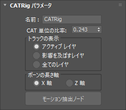 CATRig のスケール比。ボーンの長さ、幅、高さなどを定義する CATRig のサイズ パラメータはすべて CAT 単位で指定します。「CAT 単位について」を参照してください。