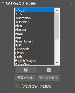 [CATRig のロードと保存](CATRig Load Save)ロールアウトには、既存の CATRig プリセットのリストおよびプリセットを使用するときのコントロールが表示されます。