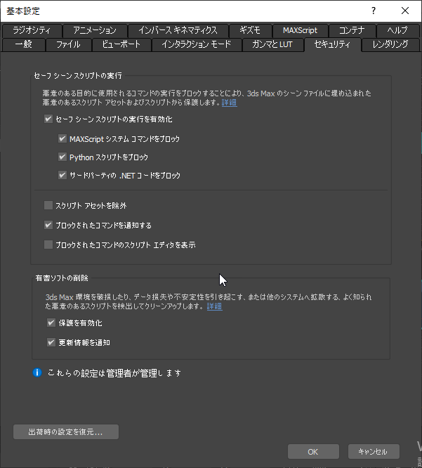 3ds Max 2022.2 Update 以降、システム管理者はネットワーク上のマシンの[セーフ シーン スクリプトの実行](Safe Scene Script Execution)の設定をコントロールして、ユーザによる設定の変更を防止できるようになりました。これらの設定をコントロールするには、[HKEY_LOCAL_MACHINE¥SOFTWARE¥Autodesk¥3dsMax¥24.0¥Variables¥SAFESCENE]にある次のレジストリ キーを使用します。