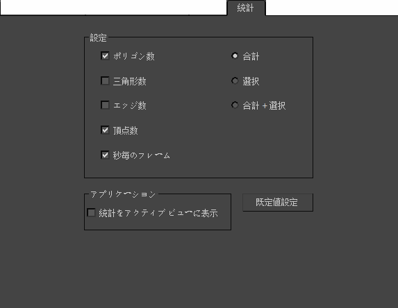 ビューポートには、頂点やポリゴンなどの数を示す統計情報を表示できます。その表示をカスタマイズするには[統計](Statistics)パネルを使用します。