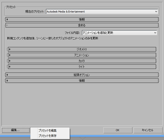FBX plug-in ユーザ インタフェースの[編集](Edit)ボタンを押すと、[編集/プリセットを保存](Edit/Save preset)オプションが開きます。
