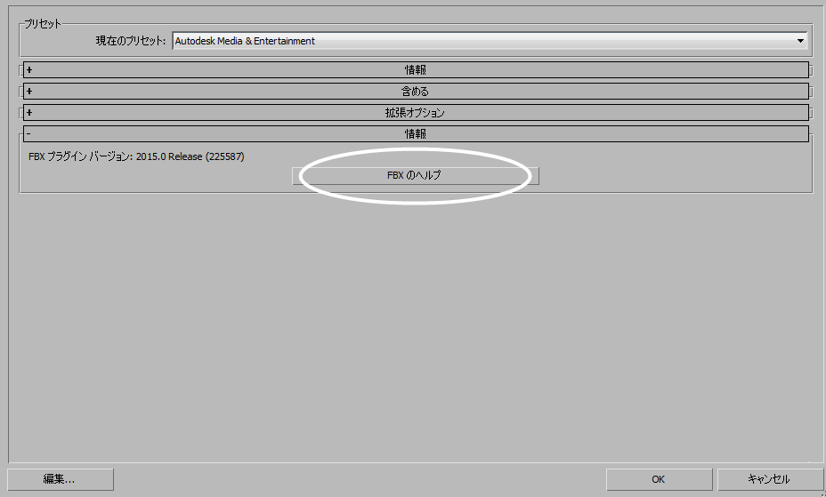 3ds Max FBX plug-inのドキュメントにアクセスするには、情報ロールアウトの[FBX のヘルプ](Help on FBX)ボタンをクリックします。