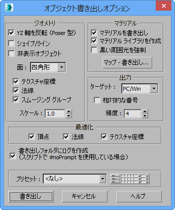 - スクリプトを使用して書き出す場合に、ログ ファイルを OBJ ファイルと同じフォルダに保存します。