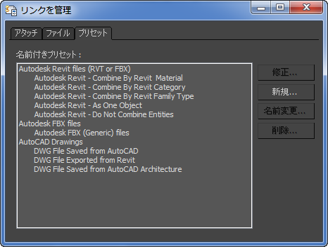 ファイルのタイプに応じて、[ファイル リンク設定: DWG ファイル](File Link Settings: DWG Files)ダイアログ ボックスまたは[ファイル リンク定義: Revit ファイル(RVT/FBX)](File Link Settings: Revit Files (RVT or FBX))ダイアログ ボックスを開きます。このダイアログ ボックスでは、選択したプリセットの設定を変更できます。