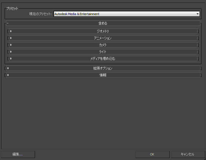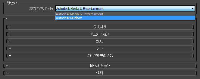 Autodesk Media and Entertainment は、3ds Max のエクスポータの既定値のプリセットです。