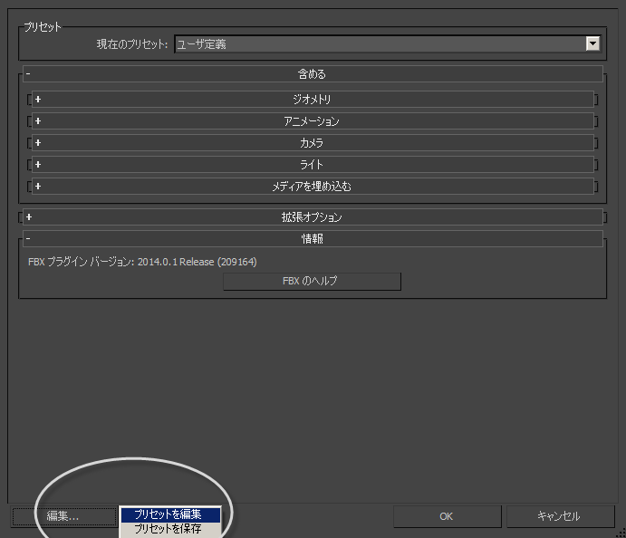 [プリセットを編集](Edit preset)または[プリセットを保存](Save preset)オプションを開くには、FBX エクスポータの UI で[編集](Edit)ボタンを押します。