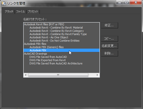 - ファイル リンク マネージャの[プリセット](Presets)パネルで、名前付きプリセットを選択します。