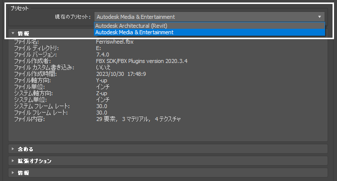 プリセットの作成と編集の詳細については、「カスタム FBX プリセットを作成する」および「FBX プリセットを編集する」を参照してください。