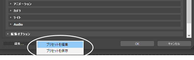 [プリセットを編集](Edit preset)または[プリセットを保存](Save preset) オプションを開くには、FBX インポータ UI の[編集](Edit)ボタンを押します。