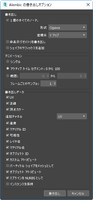 Alembic ファイルを書き出すと、次のデータが自動的に書き出されます。