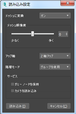 - オブジェクトを編集可能メッシュ オブジェクトとして読み込む場合のオブジェクト解像度を設定します。値が大きいほど、オブジェクトの詳細度が上がり、時間やストレージのコストが高くなることがあります。値を小さくすると詳細度が低いオブジェクトになります。指定できる範囲は -10 ~ 10 です。既定値は 0 です。