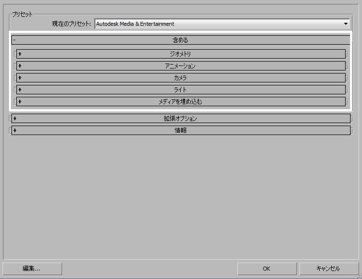 [含む](Include)ロールアウトでは、ホスト アプリケーションからの書き出しでプラグインがシーンに適用するデータや変換の種類を決定します。