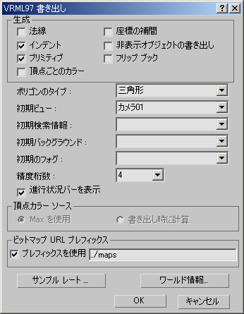 シーン内のオブジェクトに割り当てるビットマップの URL プレフィックスを指定します。テクスチャ ビットマップは、WRL ファイルと同じディレクトリに入れるか、ここで指定したディレクトリにまとめて入れておく必要があります。ビットマップをそれ以外のディレクトリに入れる場合は、書き出した WRL ファイルから手作業でビットマップを捜し出してディレクトリ名を変更する必要があります。WWW サーバでビットマップが見つからなくてもブラウザからエラー メッセージが表示されるとは限りません。
