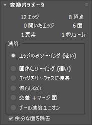 - [エッジのみ連結(高速)](Weld Edges Only)隣接したサーフェスのエッジを連結(継ぎ目またはギャップを削除)して、単一のサーフェスにします。このオプションでは、オブジェクトがソリッドであるかどうかの判別は行われません。閉じたソリッドを形成しないオブジェクトのレンダリングまたは結合では、多くの場合、この設定で十分です。