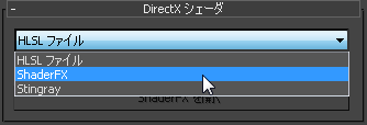 - [DirectX シェーダ](DirectX Shader)ロールアウトで、ドロップ ダウンリストから[ShaderFX]を選択します。
