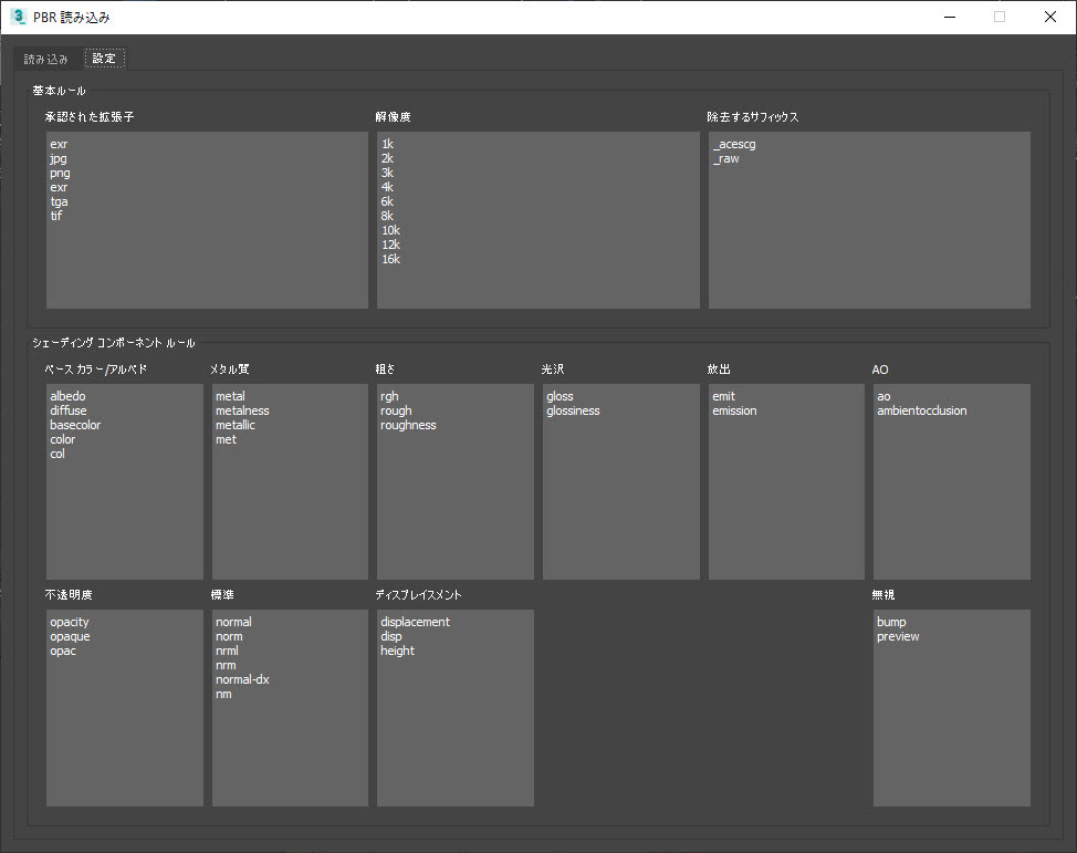 [PBR 読み込み](PBR Importer) - [設定] (Settings)タブ