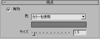 斑点のサイズを設定します。このオプションは、レンダリング時に斑点をスケールするときに便利です。範囲は 0.0 ~ 100.0 です。既定値は 1.5 です。