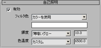 オンにすると、マテリアルが自己照明するよう設定されます。既定値ではチェックマークが付いていません。