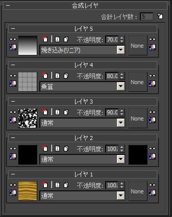 合成マップは、各レイヤの制御に個別のロールアウトを使用します。このため、レイヤの数と同じ数のロールアウトが存在します。各レイヤのロールアウトのタイトルは、任意の名前に「レイヤ」とレイヤ番号が付加されたものになっています。