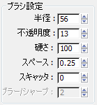 - ブラシのエッジにおけるフォールオフです。[硬さ](Hardness)の値が大きいほどエッジのはっきりしたブラシになり、この値が小さいほどソフトなエッジになります。