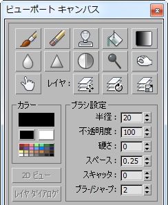 この最初のセクションでは、[ビューポート キャンバス](Viewport Canvas)ダイアログ ボックスの上部にあるコントロール、すなわちブラシとカラーの設定、および2D ビューと[レイヤ](Layer)ダイアログ ボックスを開くためのボタンについて説明します。その他のコントロールはこのダイアログ ボックスの別のロールアウトにあり、「ビューポート キャンバスのその他のロールアウト」で説明します。