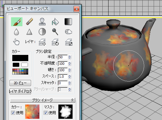 モデルの任意の位置にペイントしたり、カラー、不透明度、ブラシ イメージおよびその他の設定を変更したり、ビューポートを操作することができます。