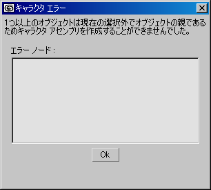 キャラクタ アセンブリ内のすべてのメンバーは、アセンブリ外の 1 つのオブジェクトにリンクすることができますが、複数のオブジェクトにはリンクできません。たとえば、ThighLeft と ThighRight はともにアセンブリの一部ですが、どちらもアセンブリの一部ではない Pelvis にリンクできます。ただし、ThighLeft と ThighRigh がそれぞれアセンブリ外部の別のオブジェクトにリンクされる場合は、アセンブリの作成は失敗し、次のようなエラー メッセージが表示されます。