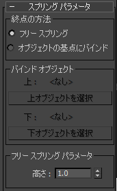 これらのコントロールを使用して、スプリングのバインド先のオブジェクトを選択します。 [上](Top)および[下](Bottom)は、任意の記述子です。2 つのバインドされているオブジェクトは任意の相互位置関係を持つことができます。バインドを完了するには、バインド オブジェクトを 2 つ選択して、[オブジェクトの基点にバインド](Bound to Object Pivots)をクリックします。