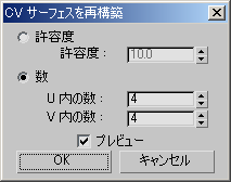このダイアログ ボックスは、CV サーフェスの[再構築](Rebuild)ボタンで開きます。ここで、サーフェスの再構築の方法を指定します。サーフェスを再構築すると、サーフェスの外観を変えることができます。