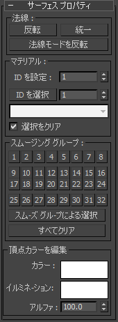 これらのコントロールを使用すると、パッチ法線、マテリアル ID、スムージング グループ、および頂点カラーに対する作業ができます。
