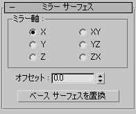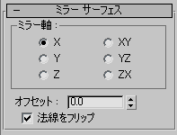 ミラー サーフェス サブオブジェクトが選択されていると、[ミラー サーフェス](Mirror Surface)ロールアウトが[修正](Modify)パネルの下部に表示されます。また、ギズモ(既定値は黄色)はミラー軸を示します。