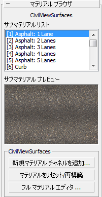 現在のシーンにロードされた Civil View マテリアルの概要を表示します。
